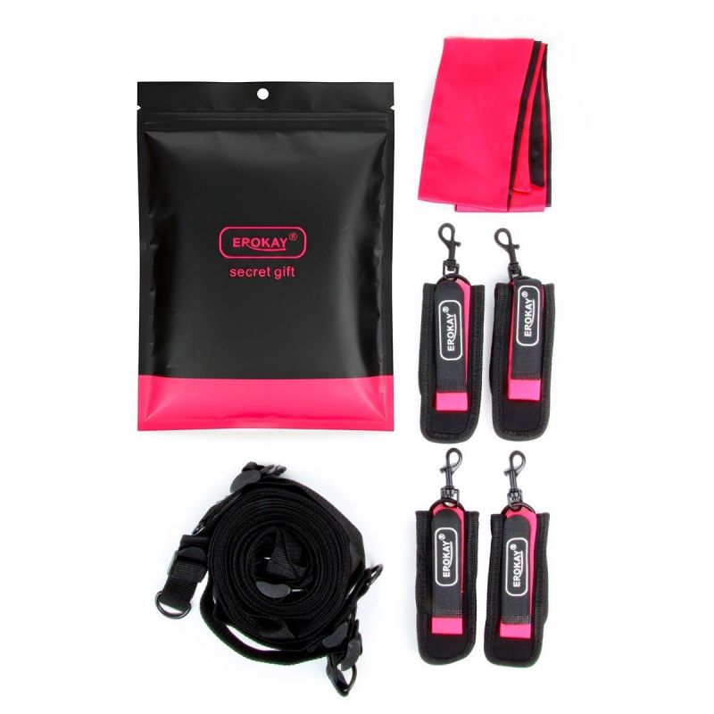 Черно-розовый эротический набор: фиксатор, оковы, наручники, повязка