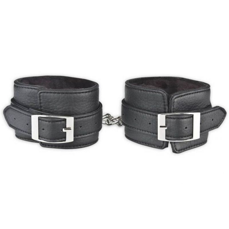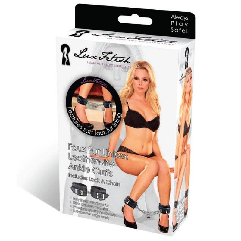 Черные фиксаторы для ног из искусственной кожи с мягким черным мехом внутри для большего комфорта при сковывании Вашего партнера. Между собой браслеты соединяются металлической цепью с крупными звеньями, застегиваются на замок с ключами (есть в комплекте).