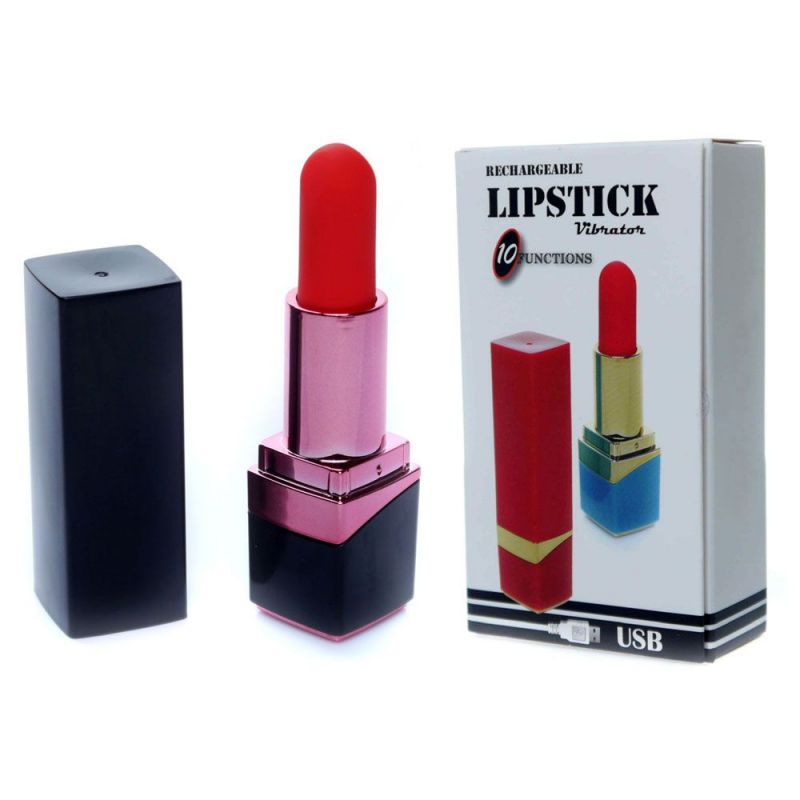 Черный мини-вибратор в форме помады. Имеет 10 режимов вибрации. Зарядка осуществляется с помощью USB-магнит кабеля.
