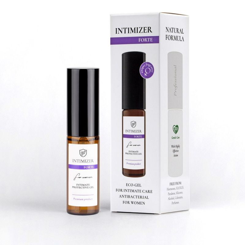Новое поколение средств для интимной гигиены от бренда INTIMIZER. Богатый натуральный состав - не имеет аналогов по количеству и концентрации активных компонентов! Комплексно выполняет все необходимые функции по поддержанию интимного здоровья и комфорта. Восстанавливает микрофлору. Оказывает длительное освежающее и ухаживающее действия, а также имеет дополнительные терапевтические свойства. Одобрен гинекологами. Эко-гель INTIMIZER на 100% заменяет привычный интимный уход. INTIMIZER FORTE – это усиленная высококонцентрированная формула широкого спектра действия, профессиональная линия средств бренда INTIMIZER. Более быстрая и надежная защита против широкого спектра патогенных микроорганизмов за счет увеличенной (на 50%) концентрации Smart частиц серебра, 30ppm. Ускоренное (на 35%) восстановление здорового микробиома интимной зоны и улучшенная профилактика возникновения дисбактериоза за счет комплекса пребиотиков и постбиотиков. В 2 раза более интенсивный увлажняющий эффект за счет еще одного нового элемента формулы – водосберегающей молекулы Aquaxyl. Еще больше привлекательности с двойной концентрацией феромона Iso E Super. Идеален для ежедневного применения и в качестве SOS-средства. Наносится и не требует смывания. Обеспечивает длительный комфорт и защиту. Предотвращает воспалительные процессы и инфекции, развитие дисбактериоза и вагинита. Помощь от молочницы. Заживляет микротрещинки, способствует ускоренному восстановлению после родов и операций. Спасает от сухости - увлажняет, питает, поддерживает эластичность и упругость. Деликатно отбеливает и омолаживает, сохраняя интимную эстетику. Гель на водной основе улучшает комфорт романтических отношений. Активные компоненты: Smart частицы серебра Молочная кислота Комплекс пребиотиков и постбиотиков (PREBIULIN, INULIN, WORESANA), Д-пантелол Fucogel, Критмум морской, Hydrovance, Биосахаридная смола, Гидролат календулы Гидролат Ромашки. Не содержит синтетических отдушек. Имеет чувственный аромат пачули.