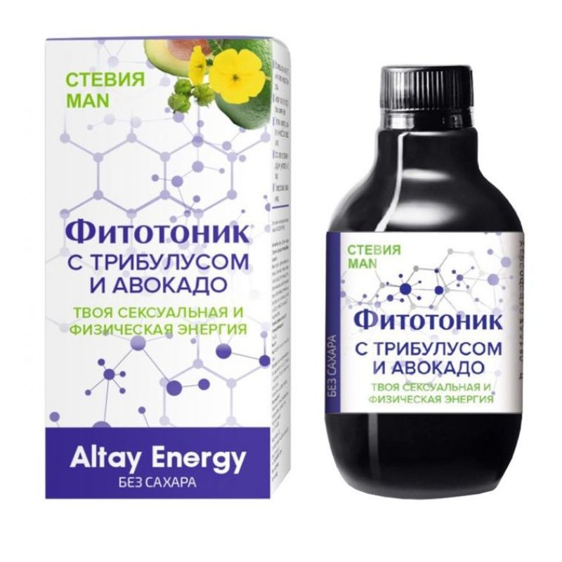 Растительный сироп «Фитотоник с трибулусом и авокадо» благодаря свойствам входящих в состав целебных трав, экстрактов, витаминов и микроэлементов оказывает выраженное противовоспалительное действие на органы мочеполовой системы мужчины, улучшает кровоснабжение органов малого таза, повышает физическую выносливость, восстанавливает мужскую половую активность. Активные компоненты: трибулус (якорцы стелющиеся), маралий корень (левзея сафлоровидная), калган, пион, шиповник, экстракт пальмы сабаль, экстракт йохимбе, экстракт авокадо, экстракт женьшеня, экстракт маки перуанской, стевия L-аргинин, яблочный пектин, янтарная кислота, фруктоза. Трибулус восстанавливает баланс синтеза тестостерона, эффективен в терапии различных видов импотенции, усиливает сексуальные возможности, а также увеличивает величину и силу мышц у спортсменов. Маралий корень устраняет усталость при упадке сил, повышает физическую выносливость и умственную активность. Калган купирует воспалительные процессы, восстанавливает повреждённые клетки печени, помогает вернуть сексуальное желание, предотвратить простатит, способствует более интенсивной выработке мужских половых гормонов. Пион усиливает поступление крови к половым органам, нормализует уровень тестостерона, избавляет от раздражительности и бессоницы. Экстракты пальмы сабаль, йохимбе, авокадо, женьшеня и маки перуанской нормализуют функцию предстательной железы, применяются для профилактики и терапии простатита, заболеваний мочеполовой системы. Это растения афродизиаки усиливающие половое влечение. L-аргинин повышает иммунные реакции, стимулирует половую активность и усиливает эрекцию. Стевия стимулирует ферментную активность, ускоряя метаболизм, снижает уровень сахара и холестерина в крови. Янтарная кислота – антиоксидант и иммуномодулятор.